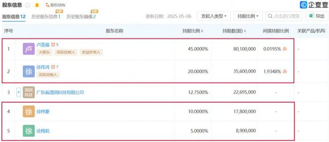 其子女徐梓豪、徐栩莉,则分别持股10%、5%,以及一致行动人鸿福四号0.39%的持股,徐氏家族合计持股82.34%。
