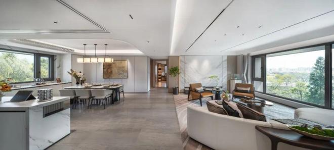 全明通透的格局,就是让整个空间都有种置身于自然中的疏朗,特别是在整个公共空间,印香山打造了约80㎡的四维社交空间,以及约30㎡社交厨房及独立餐厅,这两部分区域可开可合,可以随时切换不同场景的家庭生活模式,也更好的满足了三代同堂,不同家庭成员之间的习惯与需求。