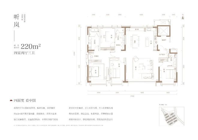 为了能够将稀缺的观景指数无限放大,项目将主力户型锁定在了220㎡的四居,更是将整个南向面宽拓展到了17.9米,同时12米的进深,构建了黄金进深开间比。其中客厅的面宽达到了6.8米。