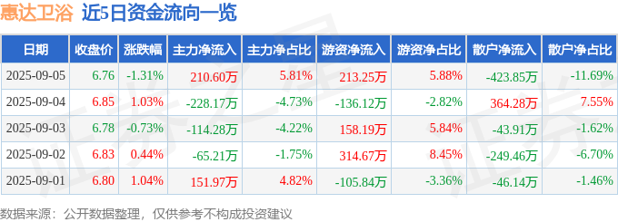 开云官方证券之星消息,截至2025年9月5日收盘,惠达卫浴(603385)报收于6.76元,下跌1.31%,换手率1.41%,成交量5.36万手,成交额3627.3万元。