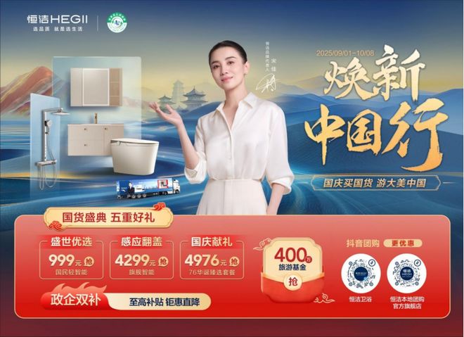 在“金九银十”到来之际,恒洁“以旧换新”再行动,“恒洁焕新中国行·国货盛典”燃情开启,买恒洁,游大美中国!自9月1日开始,活动以政企双补、壕送400万旅游基金、智能爆款与国庆套餐一站配齐等五重好礼的丰厚福利,迅速在全国铺开,持续在终端市场发酵,再次引发一场焕新风暴,影响力、参与度、覆盖面再创新高。
