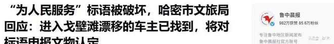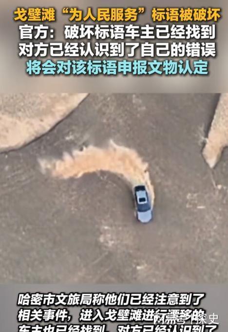 鲁中晨报,2025-10-16,“为人民服务”标语被破坏,哈密市文旅局回应:进入戈壁滩漂移的车主已找到,将对标语申报文物认定