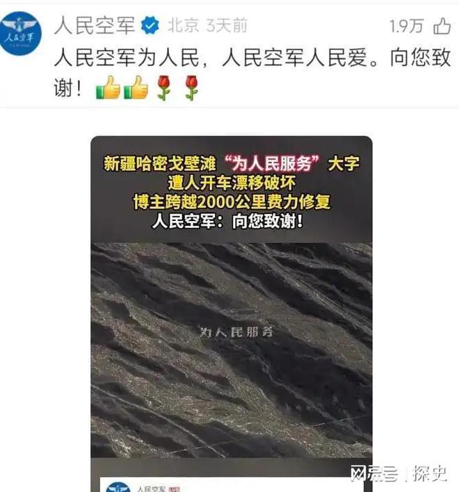 大江网,2025-10-14,新疆戈壁滩“为人民服务”大字遭人开车漂移破坏,博主跨越2000公里费力修复,人民空军:向您致谢!